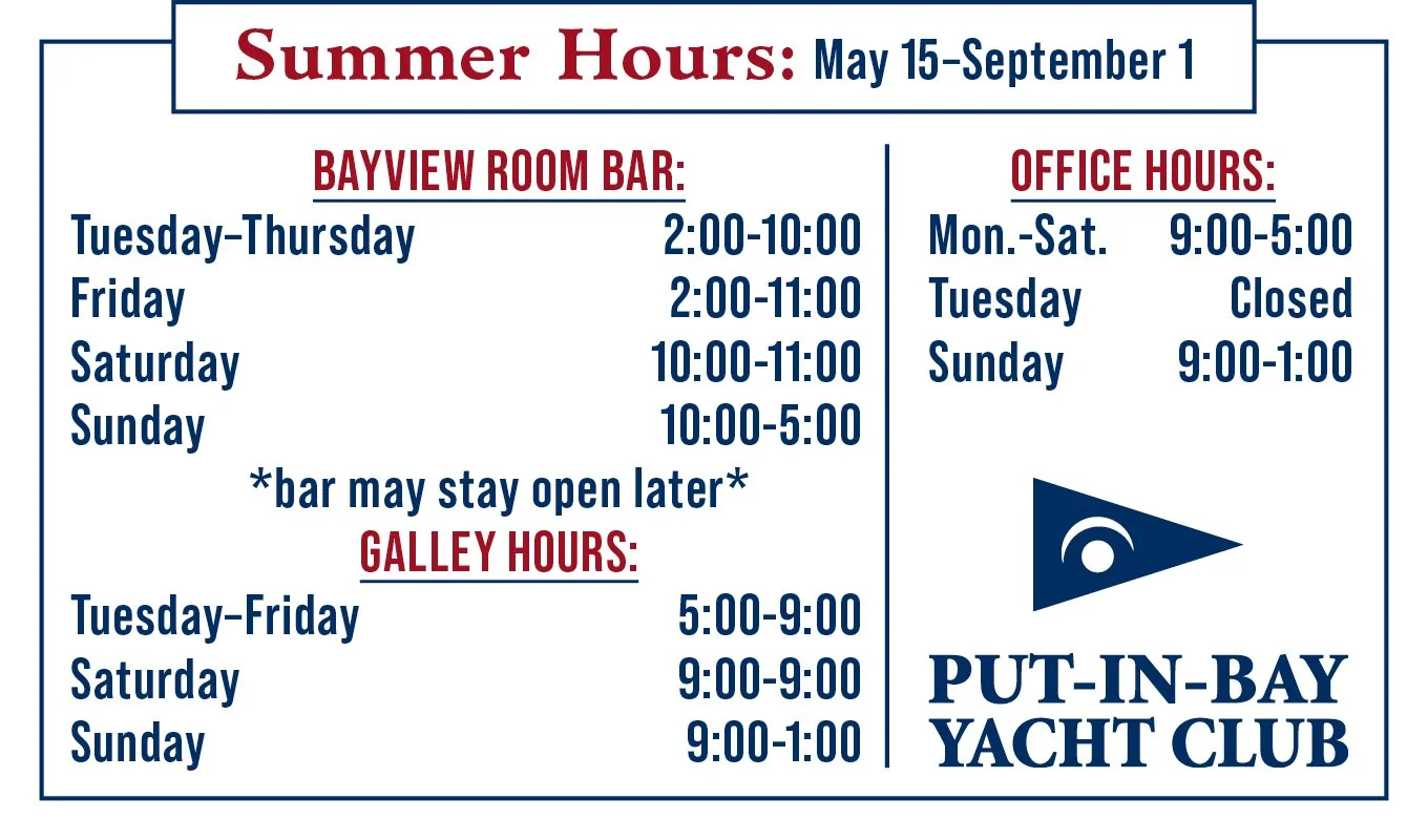 Our menu is available for take-out on days that our galley is open. Orders can be placed over the phone 419-285-4505. Call or check our Weekly Update for specials.